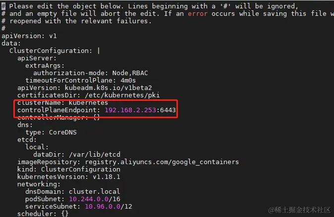 [root@server253 kubernetes]# kubectl edit cm kubeadm-config -n kube-system