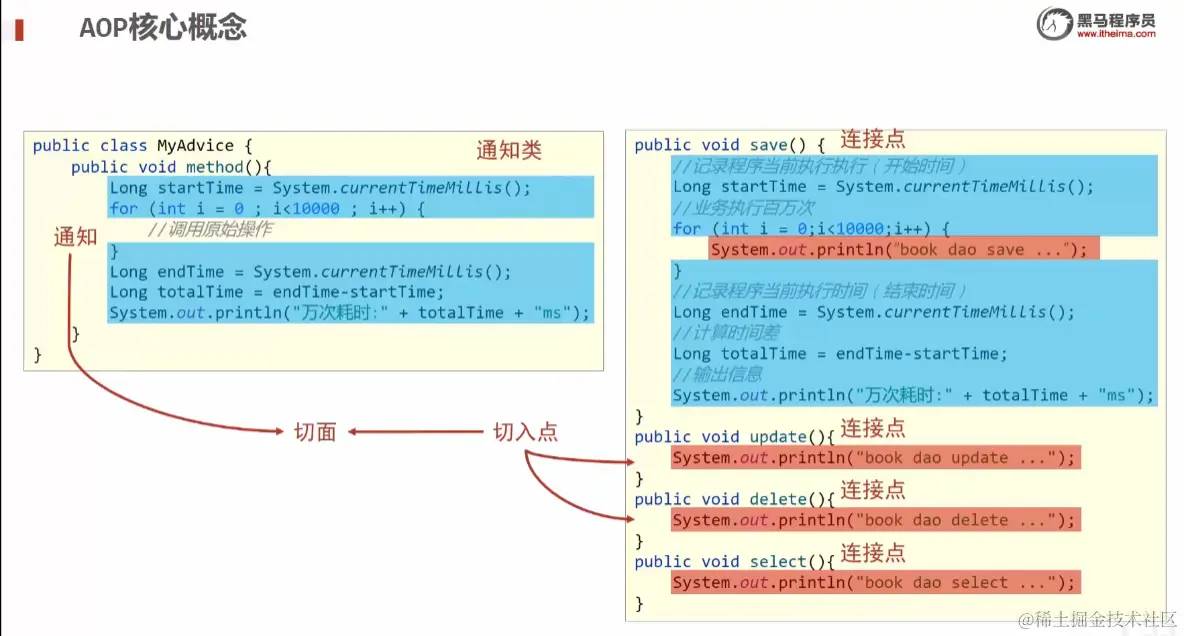 - 原始的,未来要被追加的功能叫 连接点 (黄色 joinpoint)