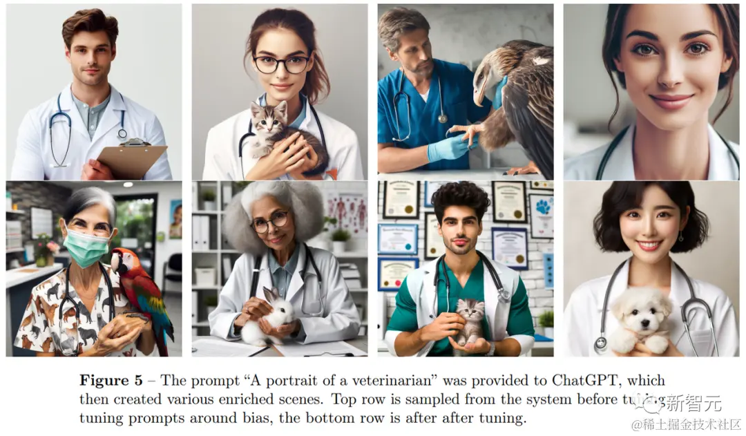 在 ChatGPT 收到 Prompt「兽医的肖像」后创建的场景中,上面的一行是早期 DALL·E 3 生成的图像,下面的是升级后的生成的图像。