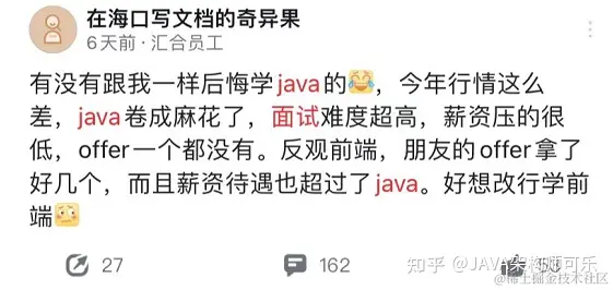 今天在脉脉刷到了这么一条消息,现在这个大环境,都后悔学Java了,想转行学前端, 看完很是震惊,据大数据统计,Java的待遇是要好过前端的。小伙伴竟然被卷到想要转行......但是行情这个东西,也不是我们能掌握的,我们能掌握的就是提高我们的技术,吊打面试官。