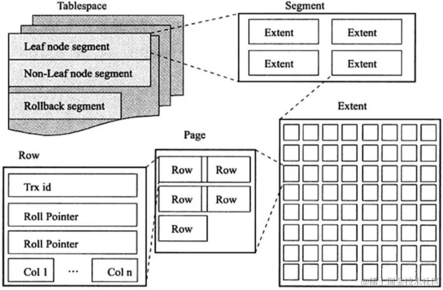 从 InnoDB存储引擎的逻辑存储结构看,所有数据都被逻辑地存放在一个空间中,称之为表空间( tablespace)。表空间又由段(segment)、区( extent)、页(page)组成。页在一些文档中有时也称为块( block), InnoDB存储引擎的逻辑存储结构大致如图所示。