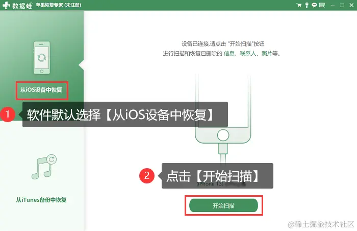 步骤2:连接您的iPhone设备和电脑,然后选择【从iOS设备中恢复】,最后点击【开始扫描】按钮。