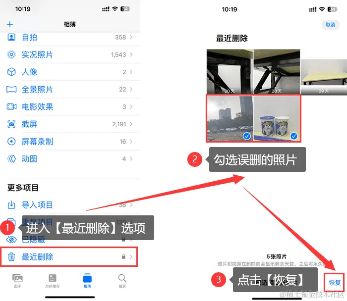 方法一:通过【最近删除】文件夹找回删除的照片