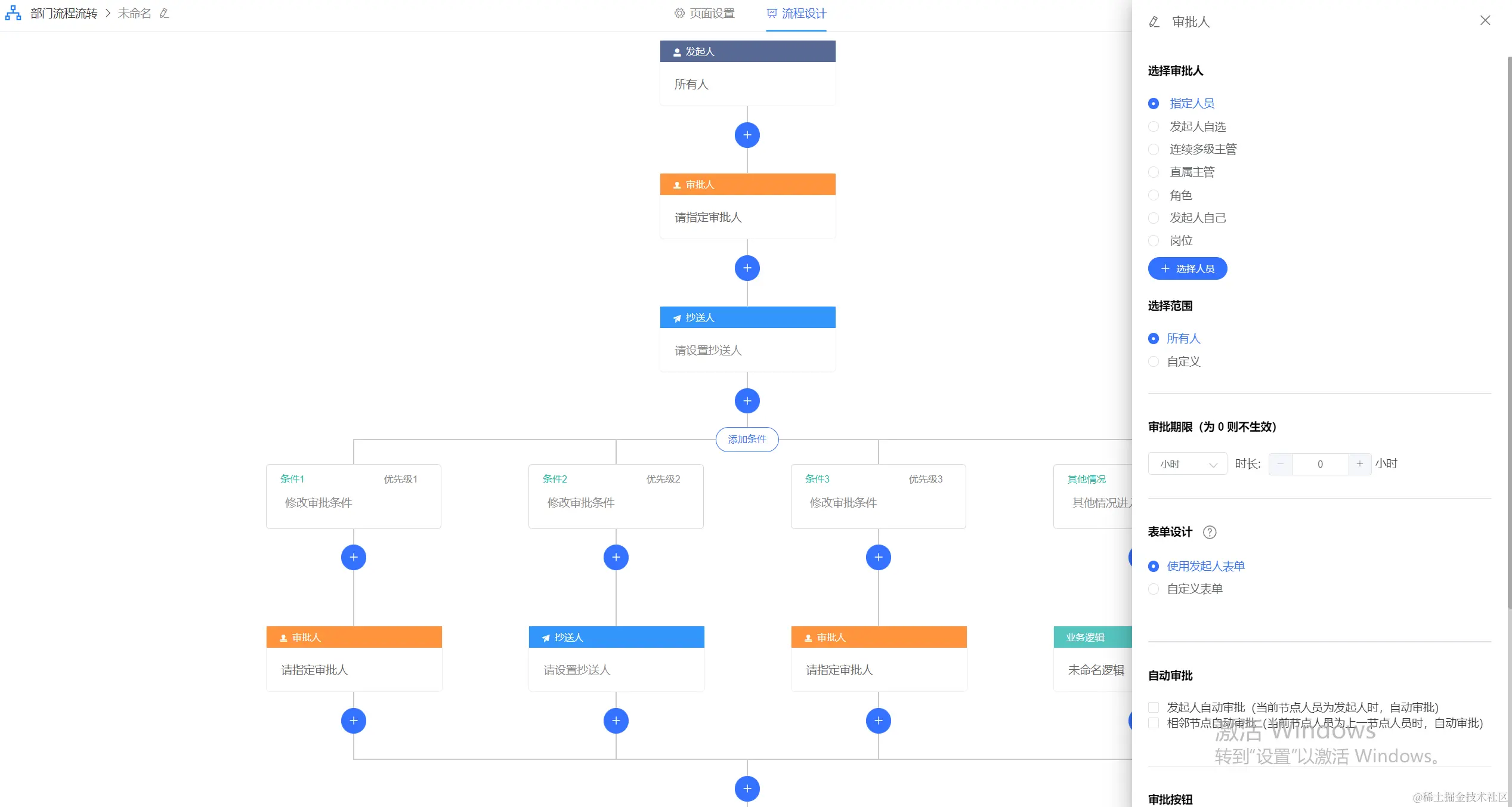 注意:在审批人节点选择【使用发起人表单】则不需要再设计(开始节点已设计好表单)。
