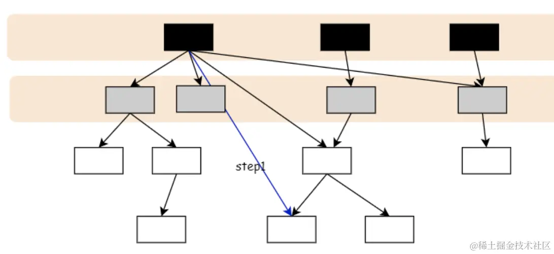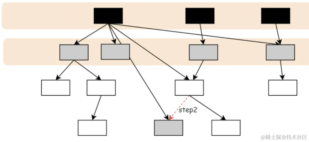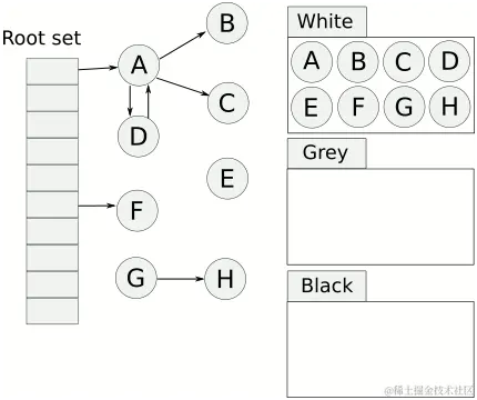 起初所有对象都是白色,从根对象出发广度优先扫描所有可达对象,标记为灰色,放入待处理队列。