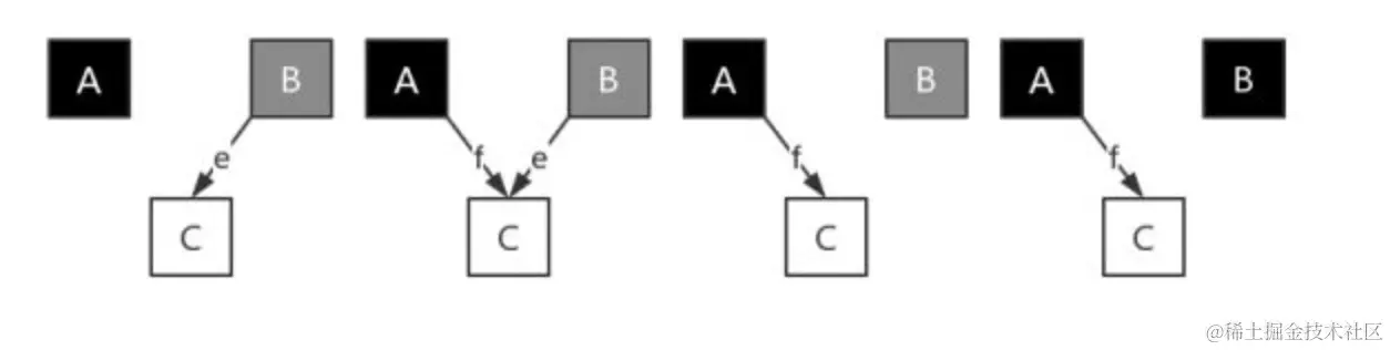 Mark过程中如果发生引用变更和新对象产生怎么办?举个例子,下图最左边是在Mark过程中的一个状态,此时发生了引用变更,新增了A->C的引用f,删除了B->C的引用e,这时出现一个致命的问题,因为A是黑色表示已经走完了整个标记过程,此时C就会保持着白色状态,直到被Sweep阶段被误清除。