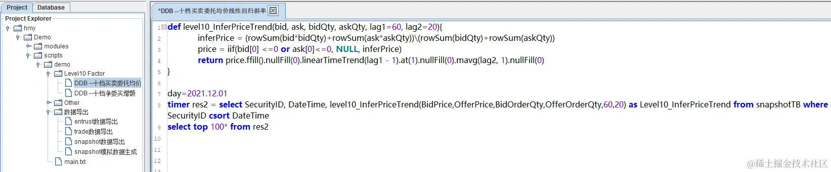 本小节主要分为三个部分:高频因子(十档买卖委托均价线性回归斜率、十档净委买增额)介绍、在DolphinDB 中因子实现和 Python 中因子实现。