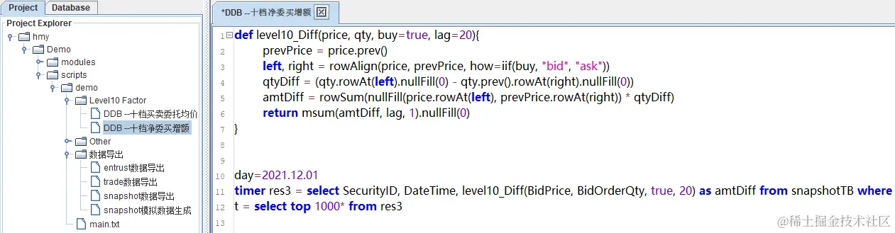 十档净委买增额的计算需要的参数分别为 BidOrderQty、BidPrice 两个字段,均为数组向量数据类型。首先通过行对齐函数 rowAlign 实现当前十档价格和前一个十档价格进行行对齐,然后通过 rowAt 和 nullFill 函数分别获取对应档位的委托量和实现价格进行对齐,最后计算总的变化额。