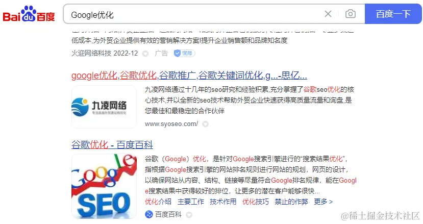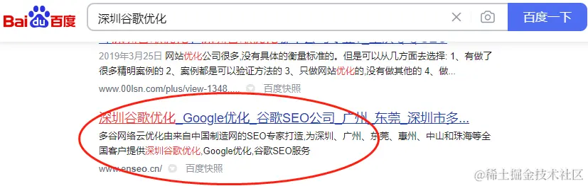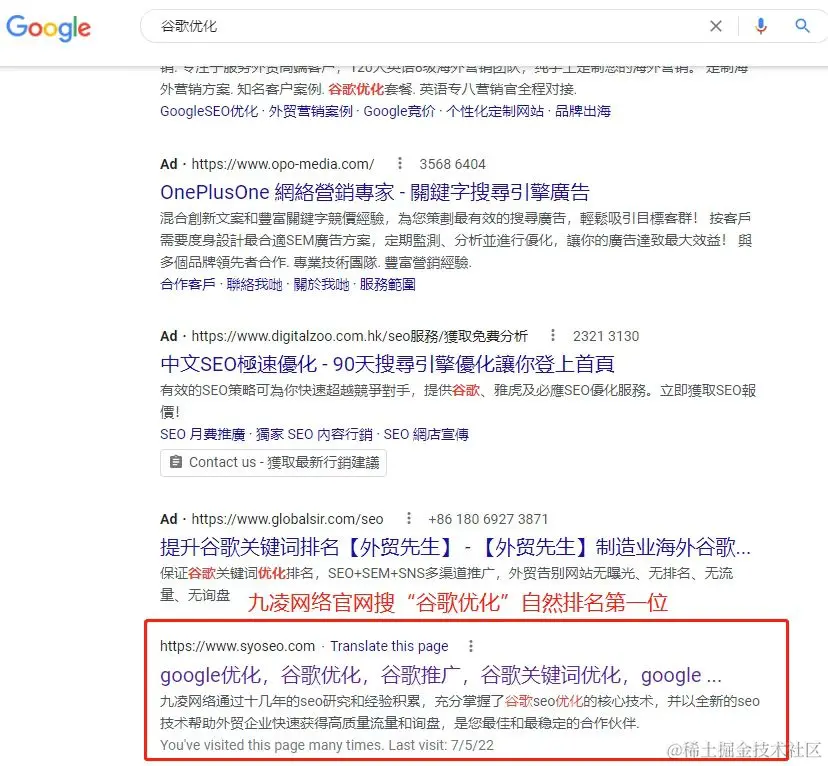 以我公司九凌网络官网为例,来看看我们九凌网络几个网站的优化情况(百度排名可作为参考,百度优化做的好公司不一定能做好谷歌优化,但是百度优化都做不好,基本上很难做好谷歌优化,因为谷歌优化的难度是远大于百度优化的):
