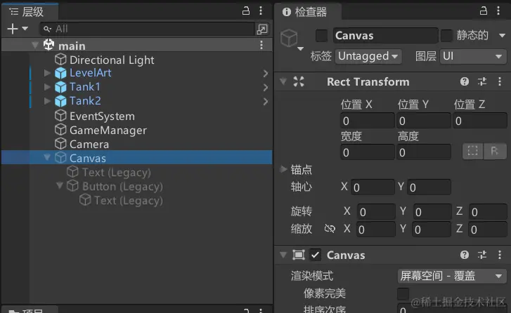 - 在场景中创建一个,Canvas,点击 UI 创建 button 和 text,并在 butten 里创建也一个 text 文本