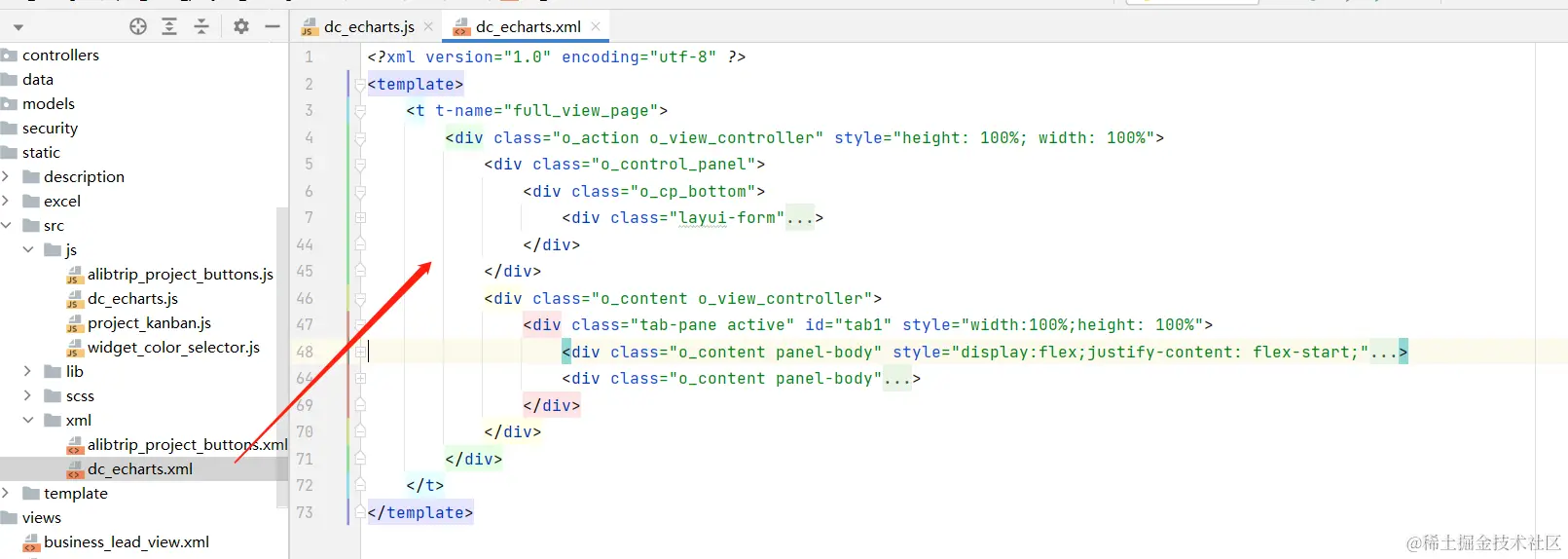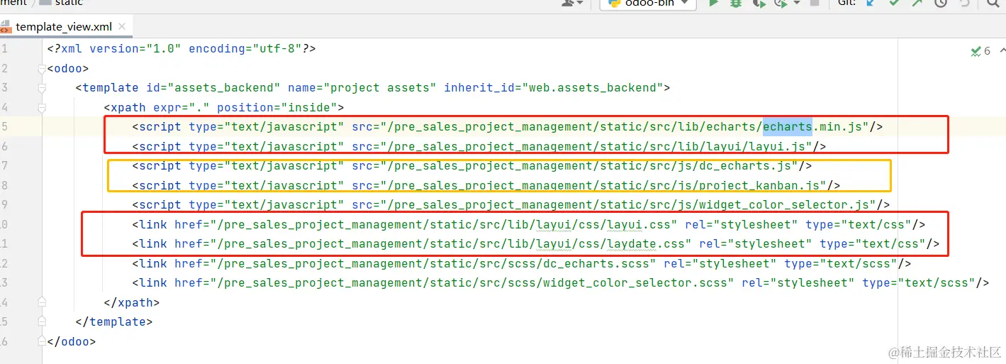 - 依据odoo14对js和scss的前置引用,将文件引入,这里我不仅引用了echarts,也引入了layui这个轻量级ui进来
