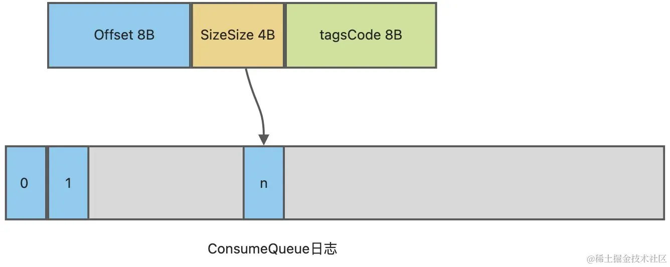 ConsumerQueue的日志是定长的CQ_STORE_UNIT_SIZE = 20字节。整体而言ConsumerQueue是最简单的。