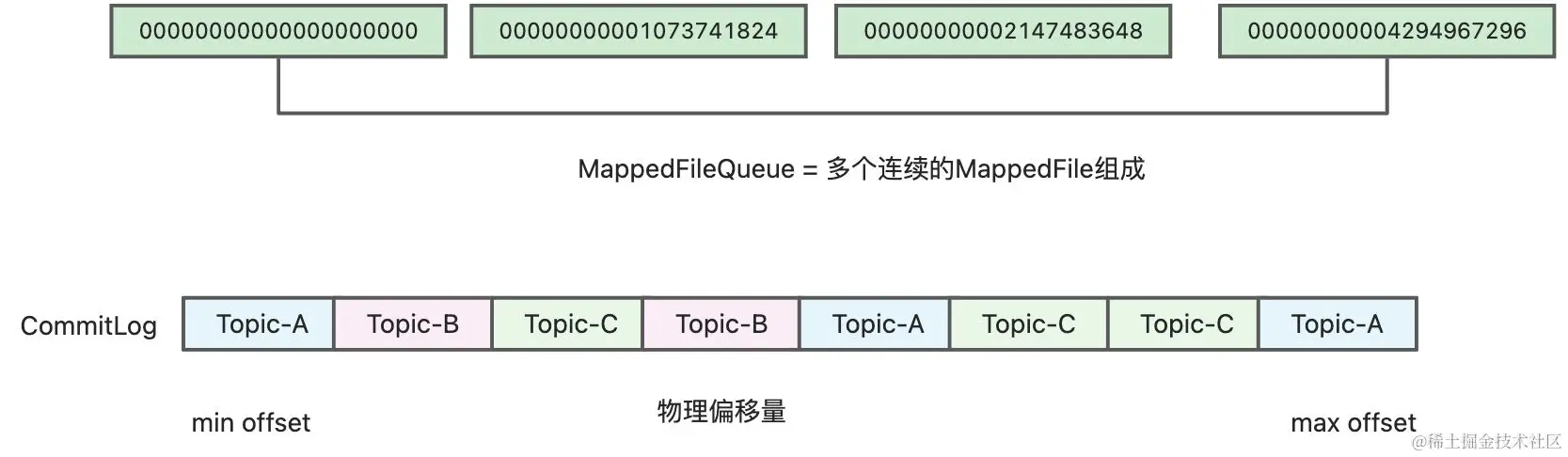 一个CommitLog下面使用MappedFileQueue持有和管理MappedFile,每个CommitLog都是有一个或多个MappedFile首尾连接形成的,由此可见RocketMQ存储日志的思想:追求极致的顺序读写。