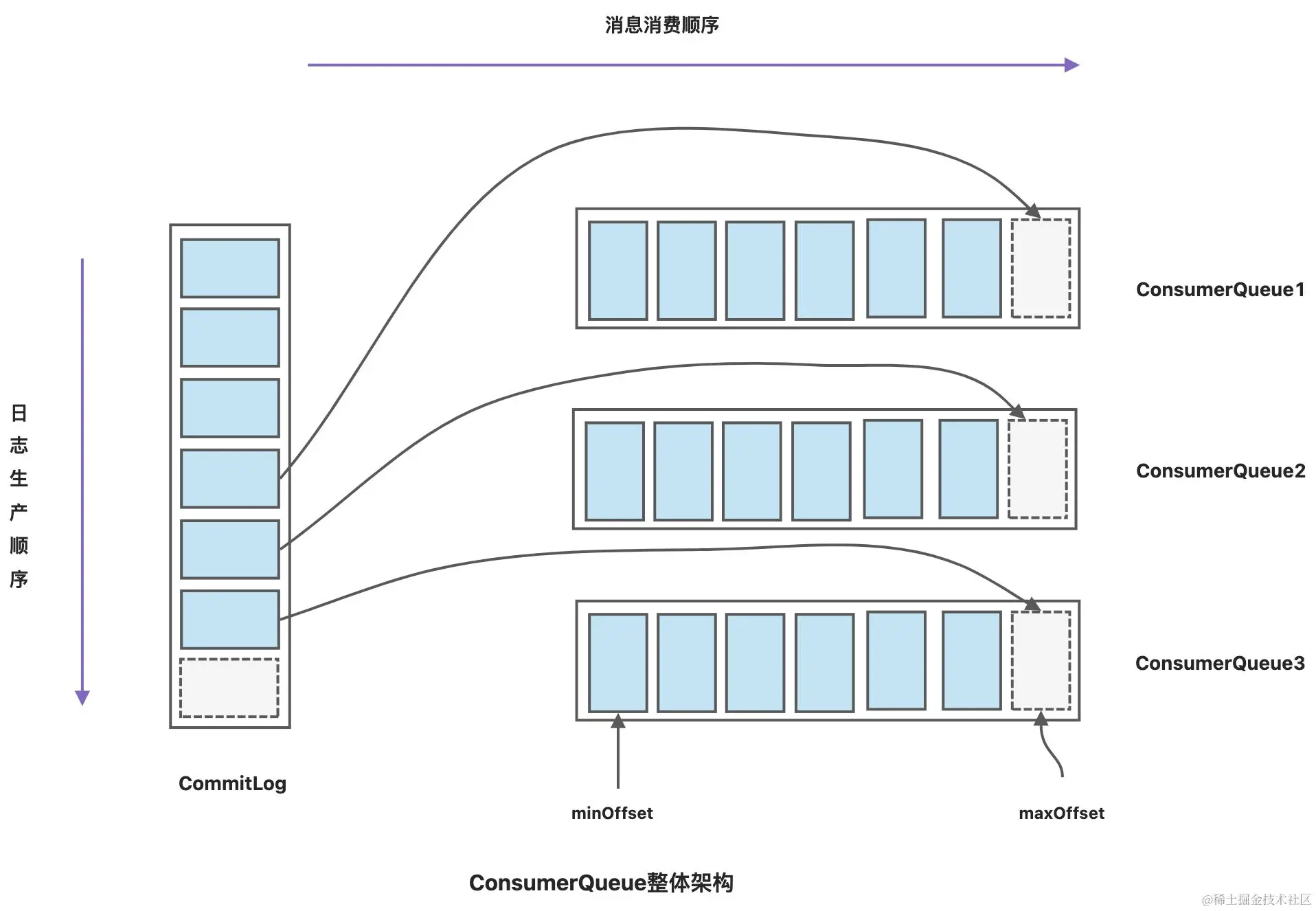 ConsumerQueue日志:存储每个Topic下某个队列的位移,通过位移可以查找到具体消息日志