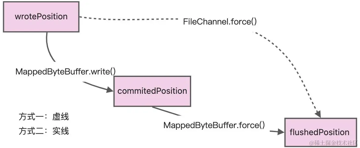 方式一 | 写入内存字节缓冲区(writeBuffer) | 从内存字节缓冲区(writebuffer)提交(commit)到文件通道(fileChannel) | 文件通道(fileChannel)flush |