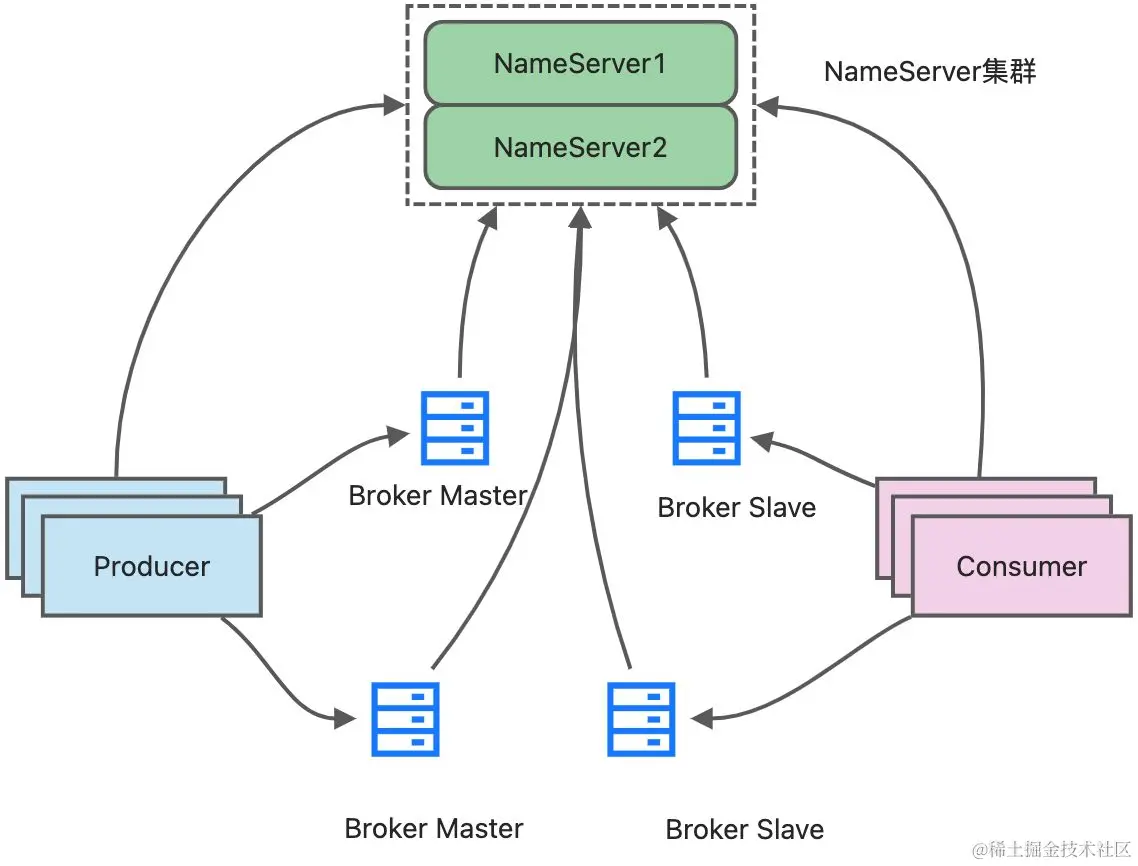 NameServer集群,Producer,Consumer集群,Broker集群。