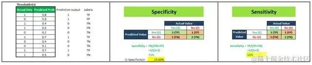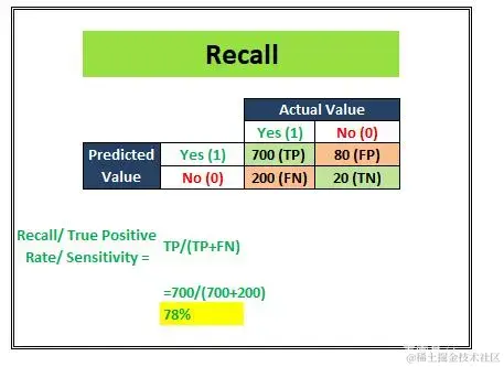 上图所示的示例表明,精度得分为75%。精度通常用于最重要的情况,即不存在大量误报。例如:在垃圾邮件检测案例中,正如我们前面所讨论的,假阳性将是一个观察结果,它不是垃圾邮件,但根据我们的分类模型被归类为垃圾邮件。过多的误报可能会破坏垃圾邮件分类模型的目的。因此,在这种情况下,判断模型性能的精确性非常方便。