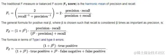 但是有一些用例,其中的区别不是很清楚,作为开发人员,我们希望同时重视召回和精确性。在这种情况下,还可以使用另一个度量标准-F1分数。它依赖于精确性和召回率。