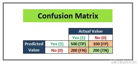 TP(真阳性):该列的实际标签在测试数据集中为“是”,我们的logistic回归模型也预测为“是”。(500次观察)