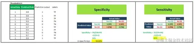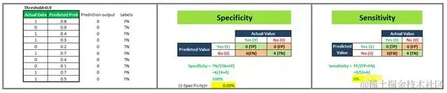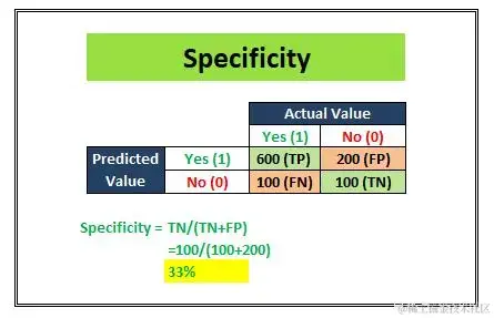 垃圾邮件检测分类器的例子,我们了解精度。继续使用那个例子,特异性告诉我们我们的模型能够准确分类多少个阴性。在这个例子中,我们看到专一性=33%,这对于垃圾邮件检测模型来说不是一个好的分数,因为这意味着大多数非垃圾邮件被错误地归类为垃圾邮件。我们可以通过观察特异性度量得出结论,这个模型需要改进。