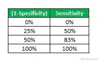 要绘制ROC曲线,我们必须绘制(1-特异性),即x轴上的假阳性率和y轴上的敏感性,即真阳性率。
