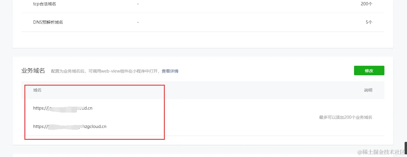 除此以外,还要配置对应的《业务域名》,这里的域名还是配置为已备案的https域名。