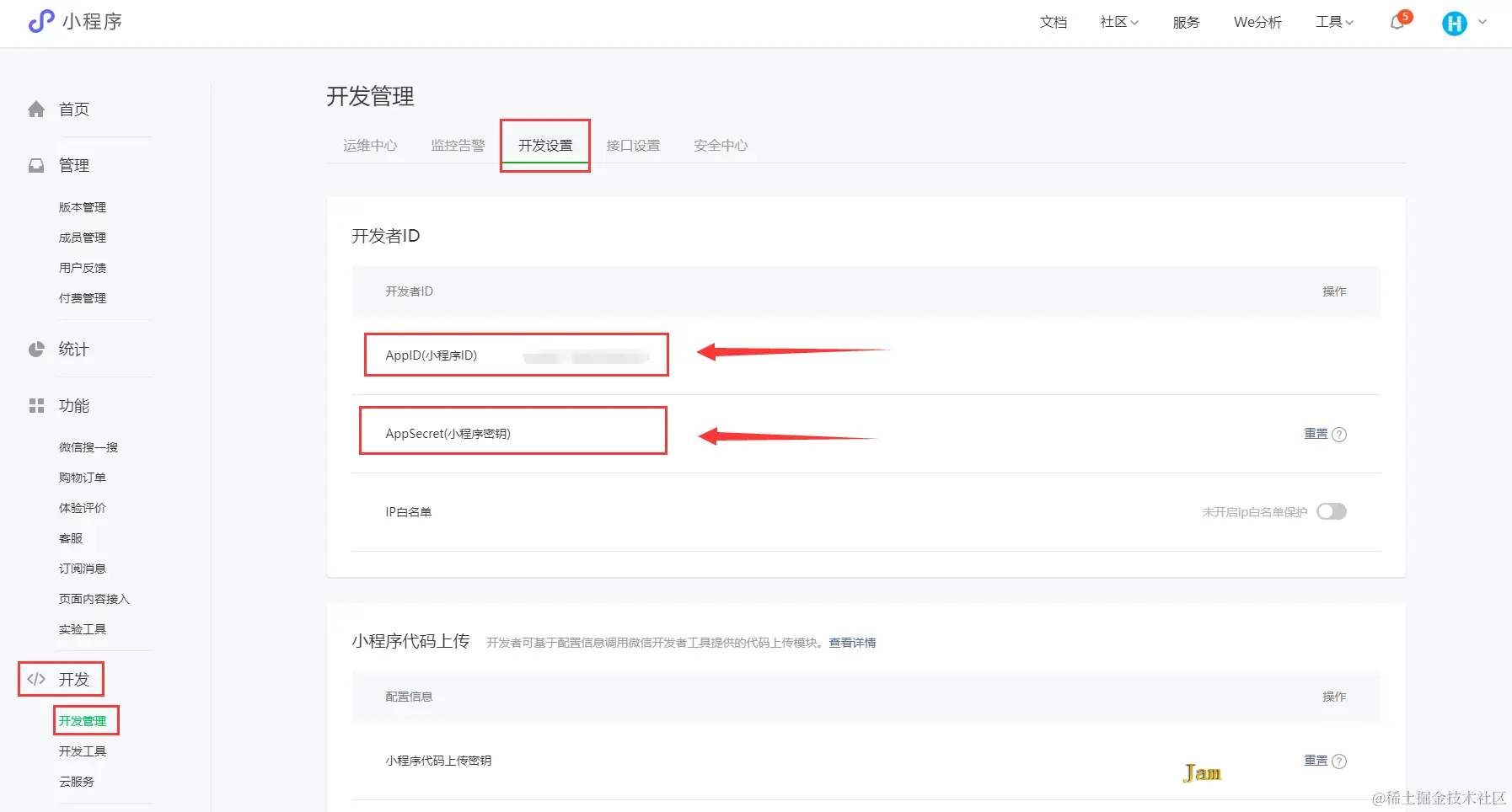 账号注册完成后,在左侧菜单中选择《开发》---《开发管理》---《开发设置》中,拿到AppID(小程序ID)和AppSecret(小程序密钥)。