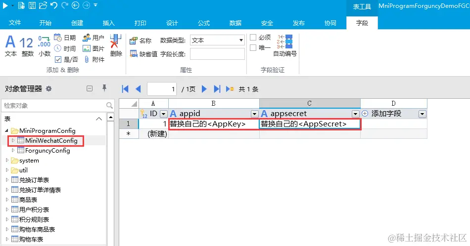 导入后,打开表《MiniWechatConfig》,将刚才注册微信小程序时拿到的AppKey和AppSecret进行替换。