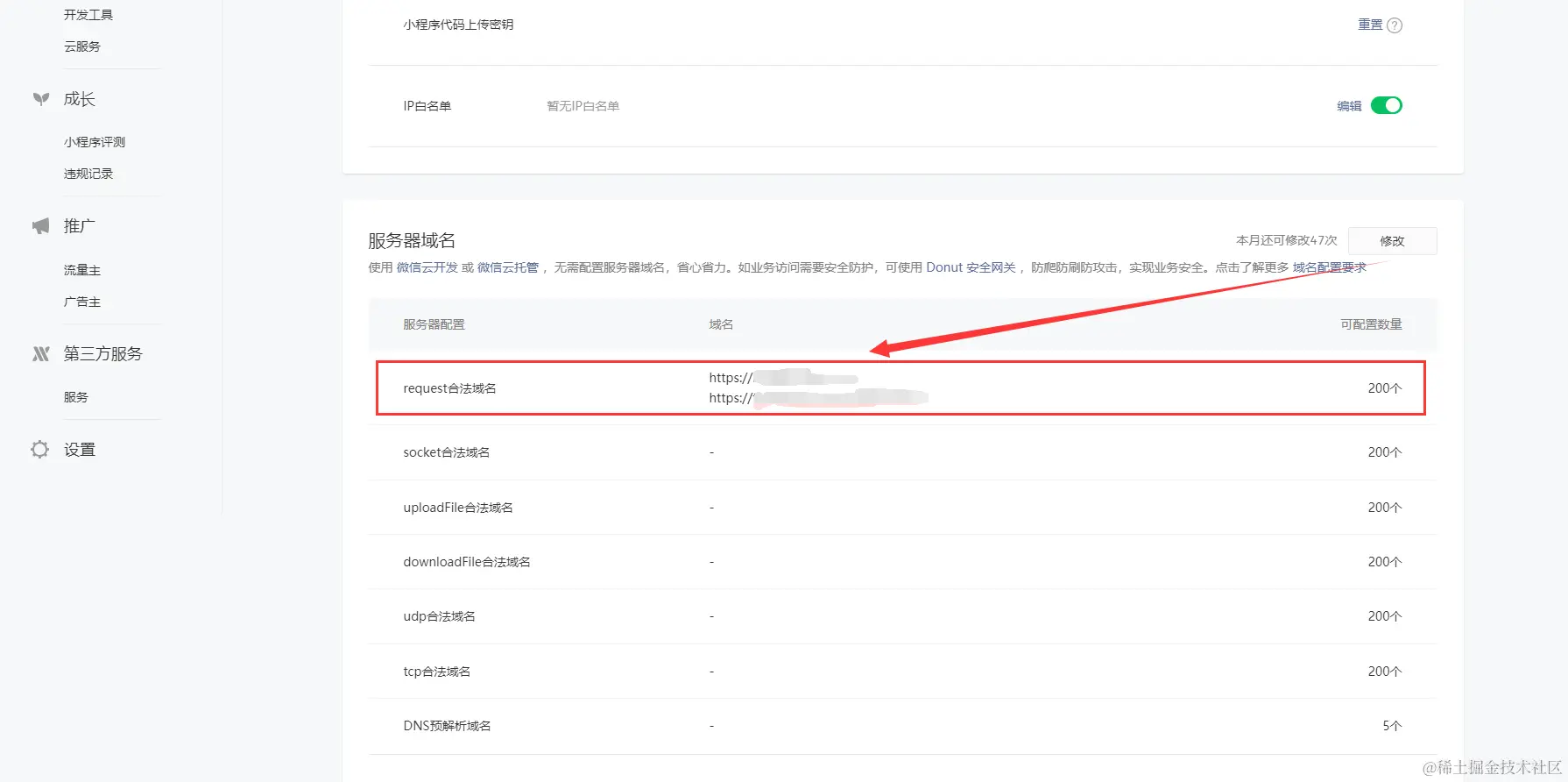 接着在下面《服务器域名》中配置request合法域名,这里的request合法域名需要填写的是上面准备活字格应用发布后的备案合法域名。