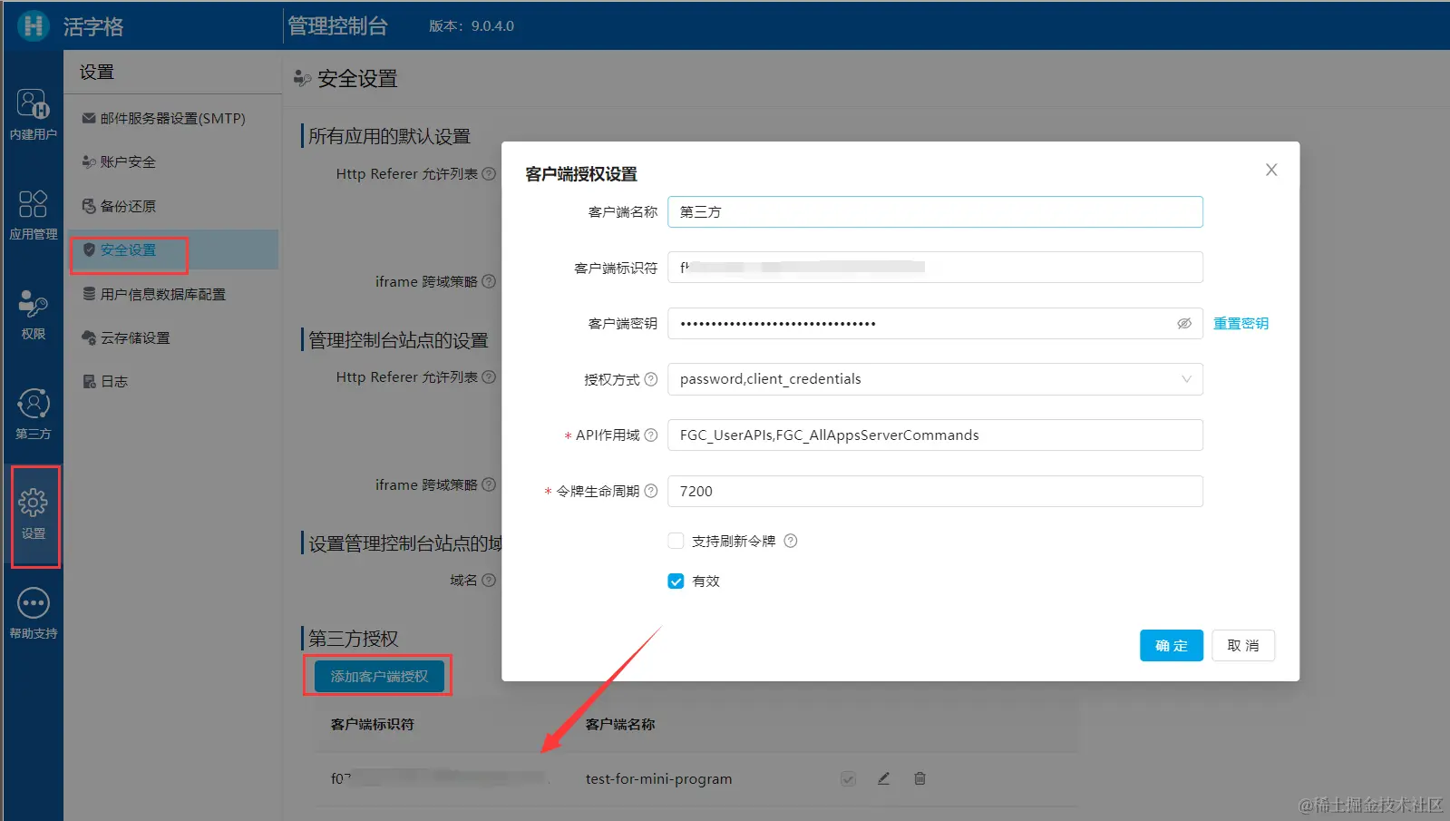 然后来到我们的活字格服务管理器,在左侧菜单栏《设置》---《安全设置》---《第三方授权》中,添加客户端授权。