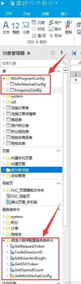 首先使用活字格设计器打开活字格工程,将下面示例工程中的数据表文件夹《MiniProgramConfig》和服务端命令文件夹《微信小程序配置服务端命令》导入到工程中。