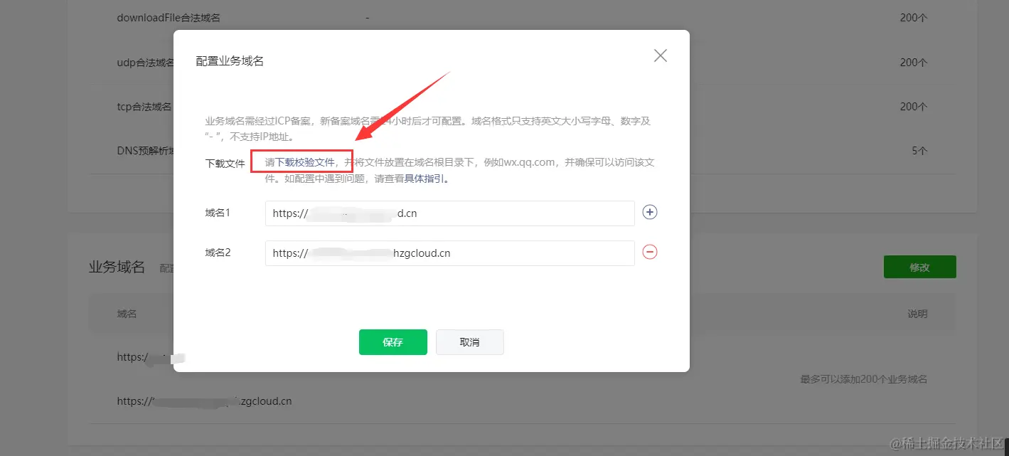 配置这个域名时,需要下载一个txt的校验文件,然后把这个文件放在域名根目录下,微信验证后就可以了。