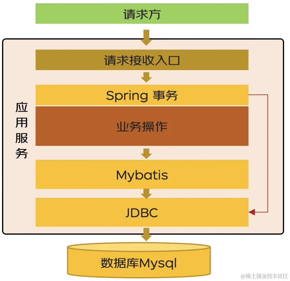 以Spring+Mybatis+JDBC+Mysql为例,常见的事务类请求的调用链路如下图。请求调用应用服务,应用服务中开启事务并进行业务操作,操作过程中调用Mybatis进行数据库类操作,Mybatis通过JDBC驱动与底层数据库交互。