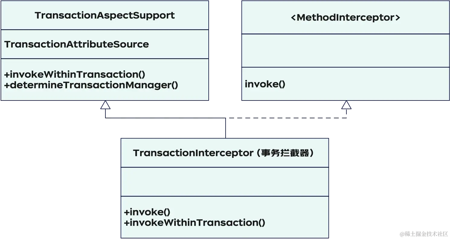 在执行目标方法时进行事务增强操作:当通过代理对象调用Bean方法的时候,会触发对应的AOP增强拦截器,声明式事务是一种环绕增强,对应接口为MethodInterceptor,事务增强对该接口的实现为TransactionInterceptor,类图如下: