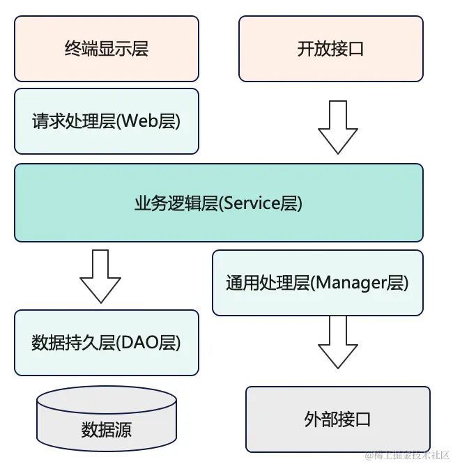 对于传统架构(如下图),建议在DAO层和Manager层加事务。Service层可以有,但重的Service或有rpc的Service操作慎用。