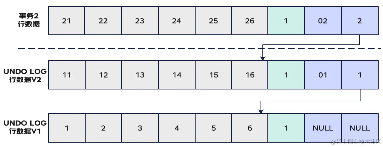 如果再有事务2操作,过程与事务 1 相同,此时 Undo log 中会有两行记录,并且通过回滚指针连在一起,通过当前记录的回滚指针回溯到该行创建时的初始内容,如下图所示,这里的undolog不会一直增加,purge thread在后面会进行undo page的回收,也就是清理undo log。