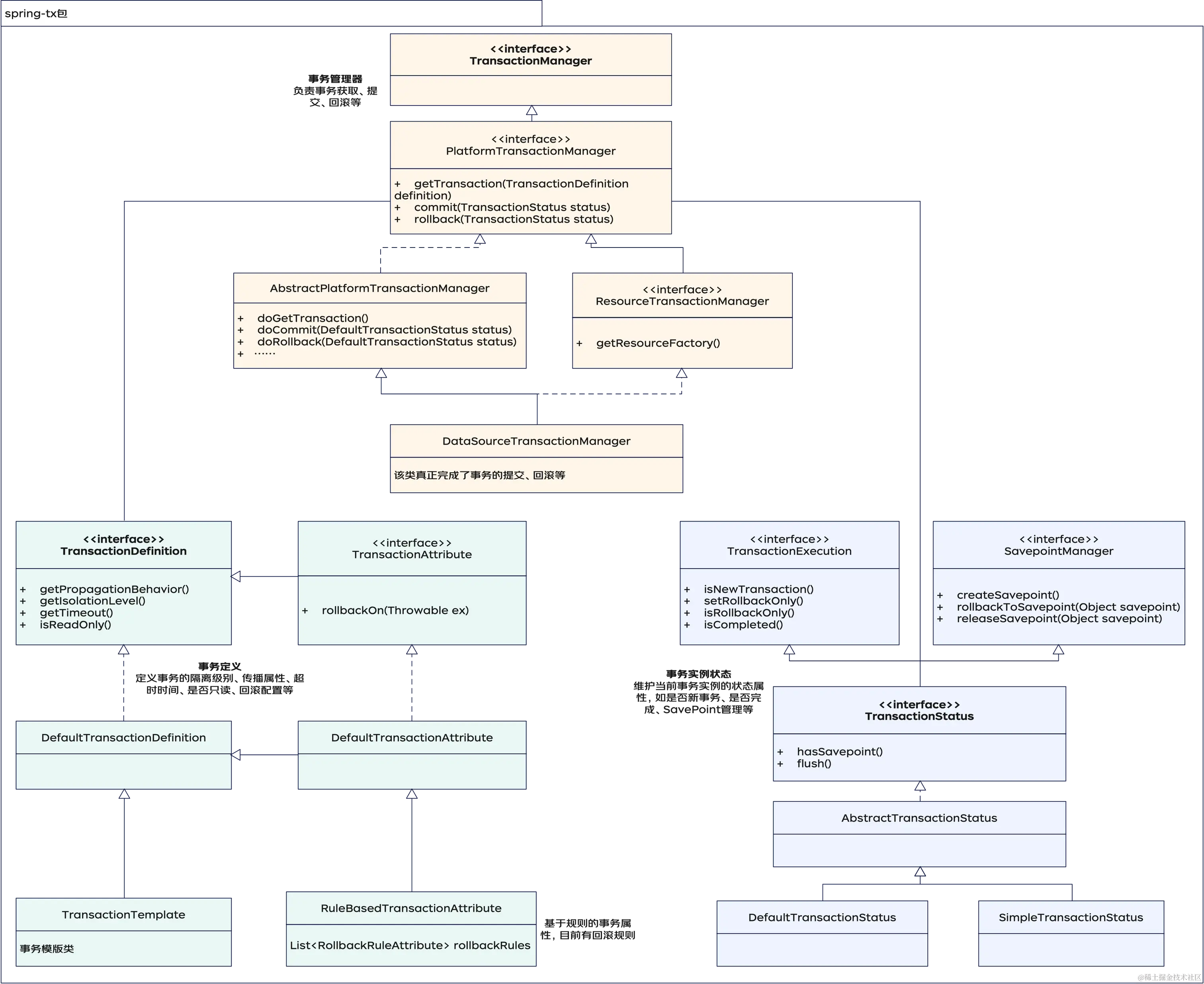 spring事务相代码主要位于spring-tx包,如TransactionInterceptor。spring-jdbc包中有spring jdbc对事务的相关支持实现,如JdbcTransactionManager。核心类如下图,主要有三大部分:事务管理器(TransactionManager)、事务定义(TransactionDefinition)、事务状态(TtransactionStatus), 这也是经常见的一种架构思维,将功能模块抽象为配置态定义、运行态实例和执行引擎,在开源组件jd-easyflow(github.com/JDEasyFlow/…中也是此种设计理念。从下面的类图可以Spring的设计非常有层次化,很有美感。