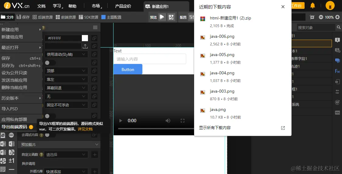 而且由这个iVX CN 云IDE 生成的前端页面我们是可以导出来源码的!这是最关键的部分,因为对于程序员来说,拿到源码我们才能更加方便的修改。这个在iVX是完全免费的。我们只需要点击右上角的文件,然后选择最后一个菜单项导出前端源码(见下图)。即可将源码导出通过浏览器下载到本地,图中的 html-新建应用1(2) 这个压缩包就是我下载到本地的前端源码。可以进行二次开发!