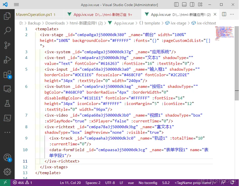 我们再来看一下由iVX生成的vue前端源码,需要做什么调整我们直接在该文件中进行增删即可。可能会有人疑惑id为什么都像那么长,我个人估计iVX那边在生成的时候,使用的是类似MD5或者随机生成的字符串。不过想要改也容易,现在的IDE功能都很强大,支持多个相同的字符串同时删改。vscode的快捷键好像是ctrl+d,IDEA的快捷键是shift+f6,改起来也非常方便。最主要的是用iVX生成的代码省心,不需要一个个敲代码了,妥妥的提升效率的神器。