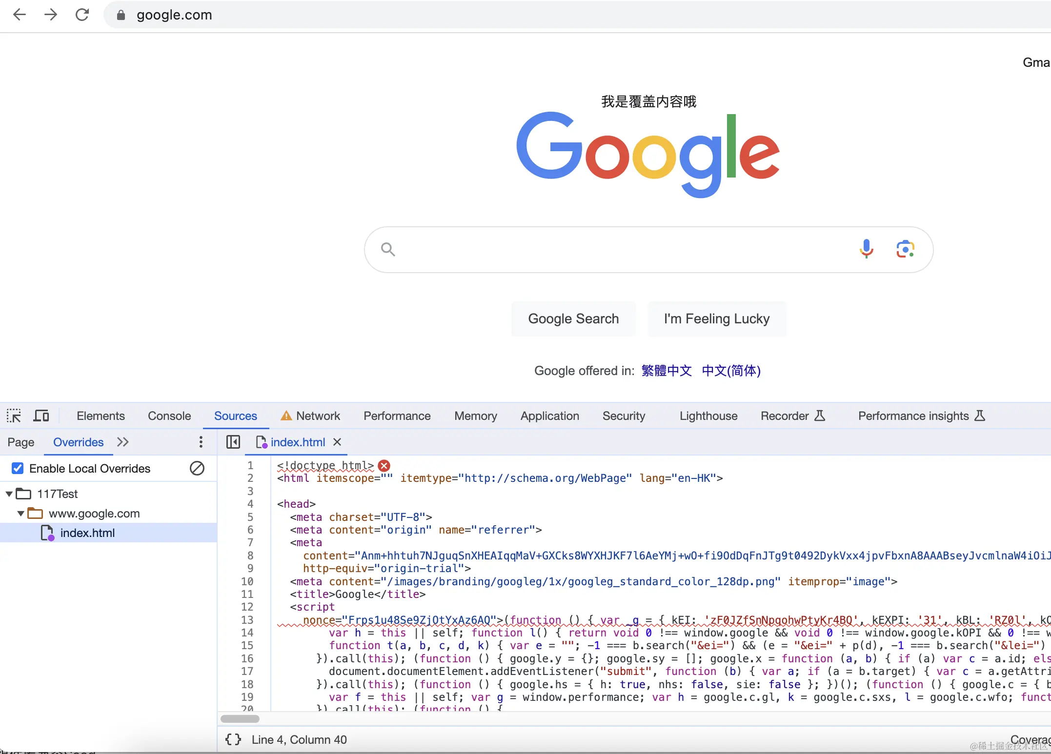 设置覆盖后,DevTools 会将你的配置同步到 Sources > Overrides > Editor,以便覆盖网页内容。