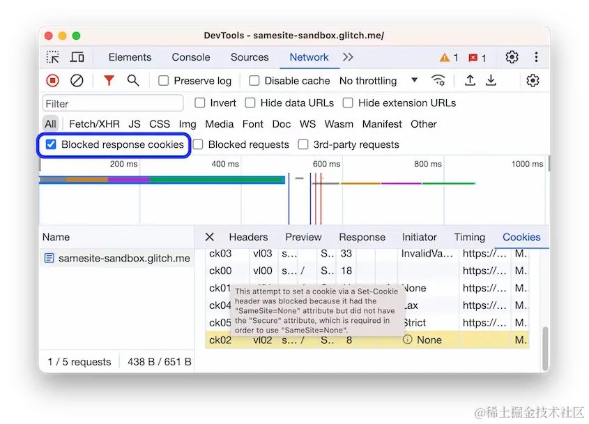 此外,网络(Network) 面板中的 阻止的响应 cookie 过滤器(Blocked response cookies) 已被重新措辞,以明确它仅显示阻止的响应 cookie。