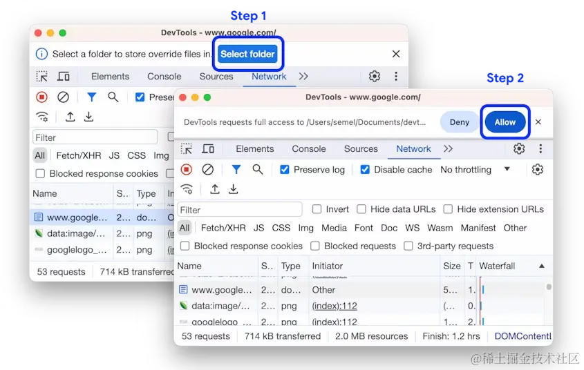 如果设置了本地覆盖但被禁用,DevTools 会启用它们。如果尚未设置它们,DevTools 会在顶部的操作栏中提示你。选择一个文件夹来存储覆盖并允许 DevTools 访问它。
