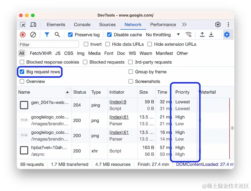 此外,可以在网络(NetWork) 面板的优先级(Priority) 列中找到相同的信息,并启用大请求行(Big request rows) 设置。