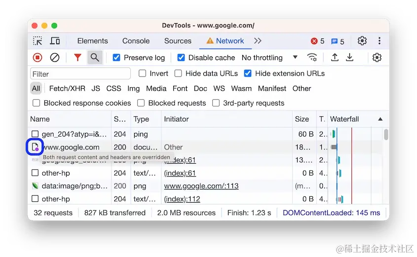 请注意,被覆盖的资源在“网络”面板中用 指示。将鼠标悬停在图标上可查看被覆盖的内容。