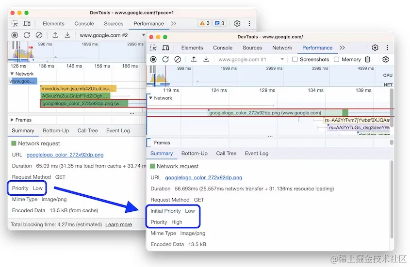 现在,性能(Performance) 面板在网络(NewWork) 轨道中的事件摘要(Summary) 中显示两个优先级字段:初始优先级(Initial Priority) 和最终优先级(Priority) ,而不仅仅是单个优先级(Priority)。通过这个附加字段,现在可以查看事件的获取优先级是否发生变化并调整下载顺序。有关更多信息,请参阅使用 Fetch Priority API 优化资源加载。