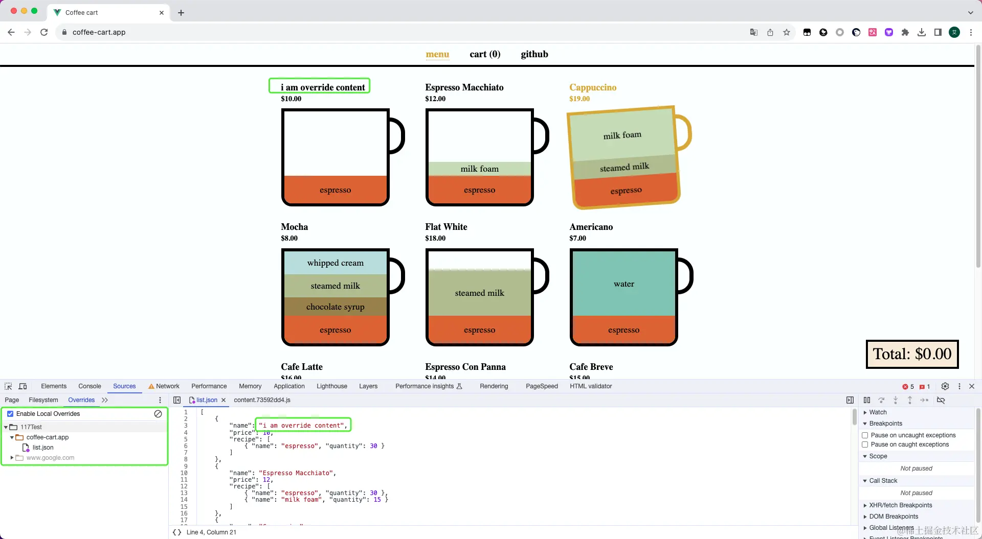 - 操作的头部信息会在Sources>Overrides>coffee-cart.app>.headers中保存