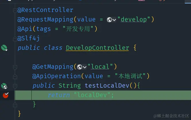 该日志是容器里面的日志,我们可以先在项目中打个断点,然后通过浏览器访问localhost:8082/develop/local