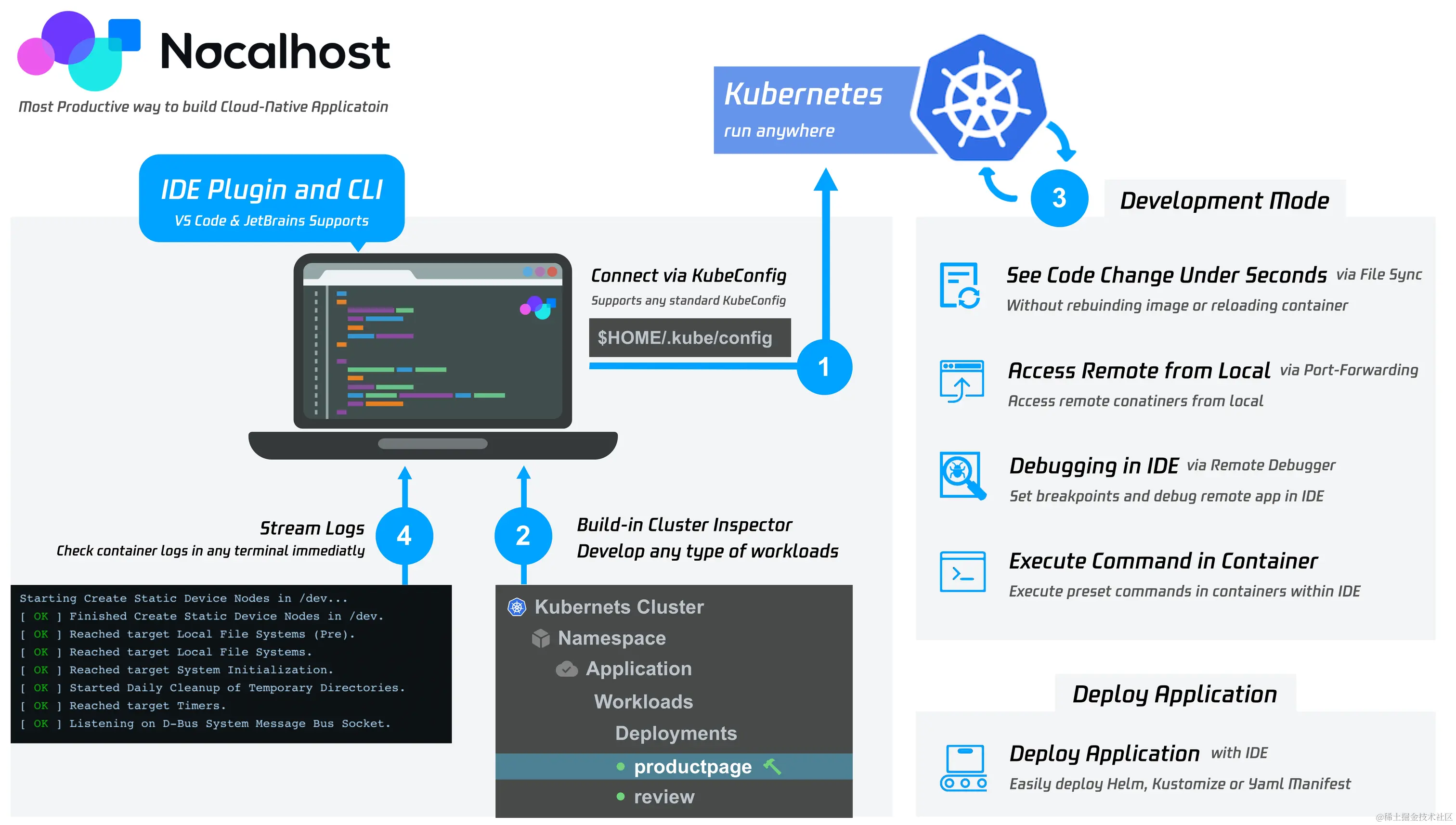 Nocalhost 由单个二进制 CLI 和 IDE 插件组成。 理想情况下,您可以直接将它与您熟悉的 IDE 一起使用。 Nocalhost 不需要服务器端组件,因为它通过 KubeConfig 直接与您的 Kubernetes 集群通信,就像 kubectl 一样。