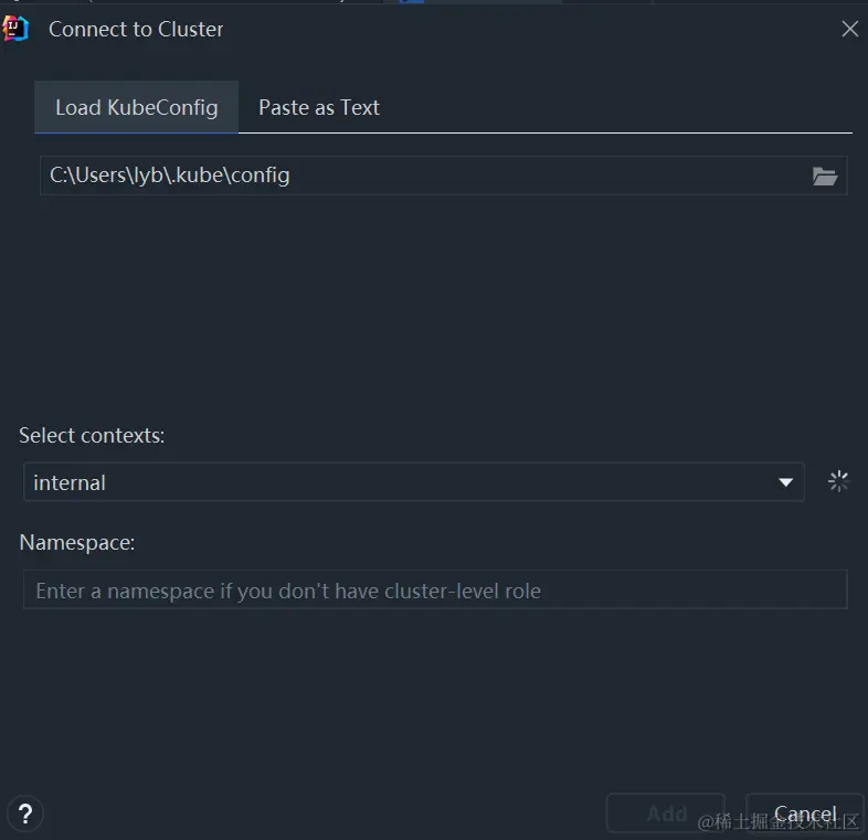 可以通过下载 kubeconfig 文件到本地,然后Load KubeConfig选择kubeconfig 保存的文件路径。或者可以直接复制