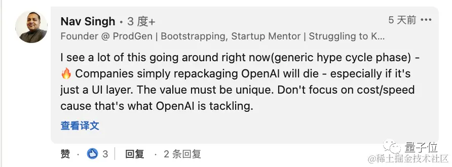 第一点对于简单包装,奥特曼举例比如有公司正在解决GPT模型的小缺陷,尤其只在界面上做文章的。一来,OpenAI已经在解决大部分工作了;二来,这些仅在成本和速度上与OpenAI一较高下的公司,竞争优势并不会长久且持续。企业必须在提供真正独特的价值。有网友联想到,前段时间红杉资本提出生成式AI进入到第二阶段——炒作和快速展示正在被真正有价值和完整的产品体验所取代。种种观点,其实不谋而合。不少业内人士都表示了肯定: